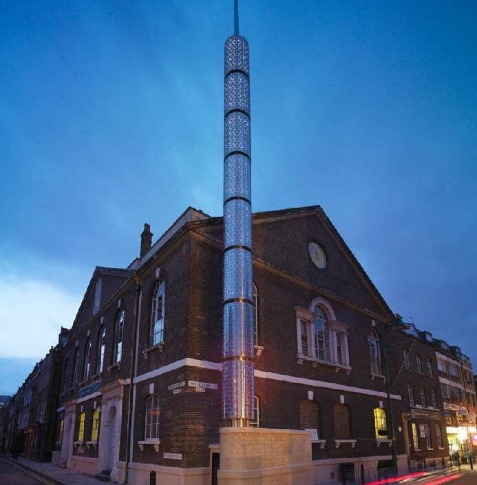 Sited in the centre of a restored grade 2 listed Victorian Gas holder frame. The Stainless Steel top ring plates were polished before each plate was cut into 16 equal sections to make up the ring. The columns that hold the ring in place are made of Stainless Steel plates that were also polished before being cut to size. Read more